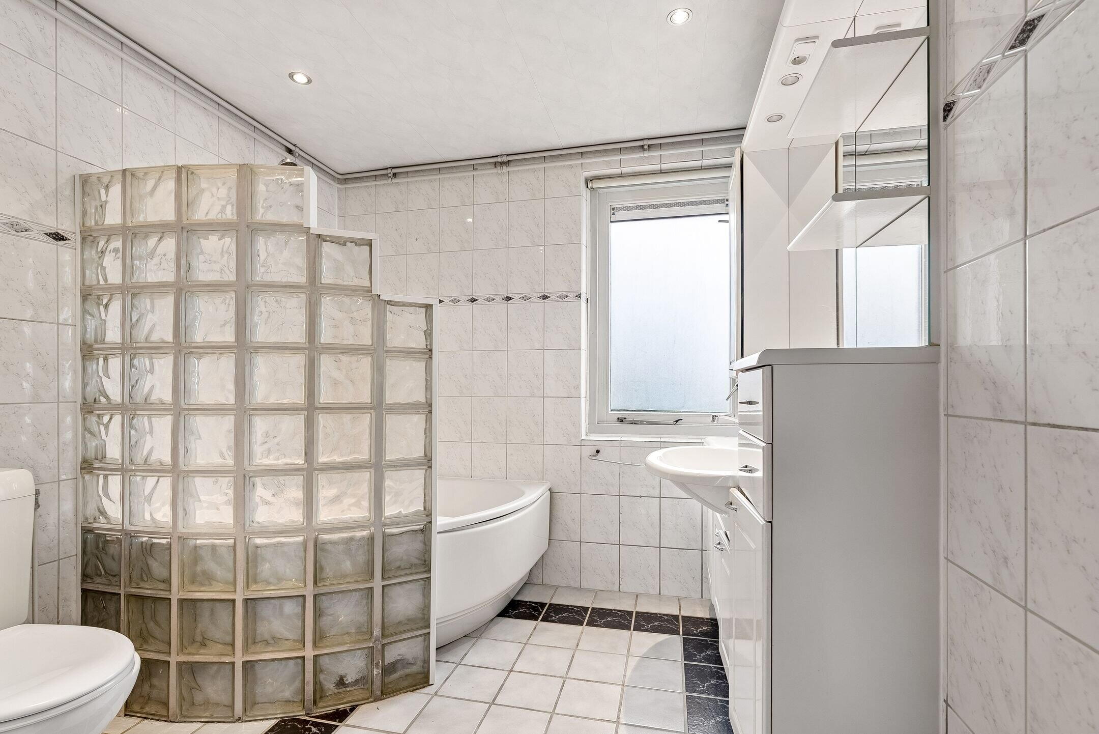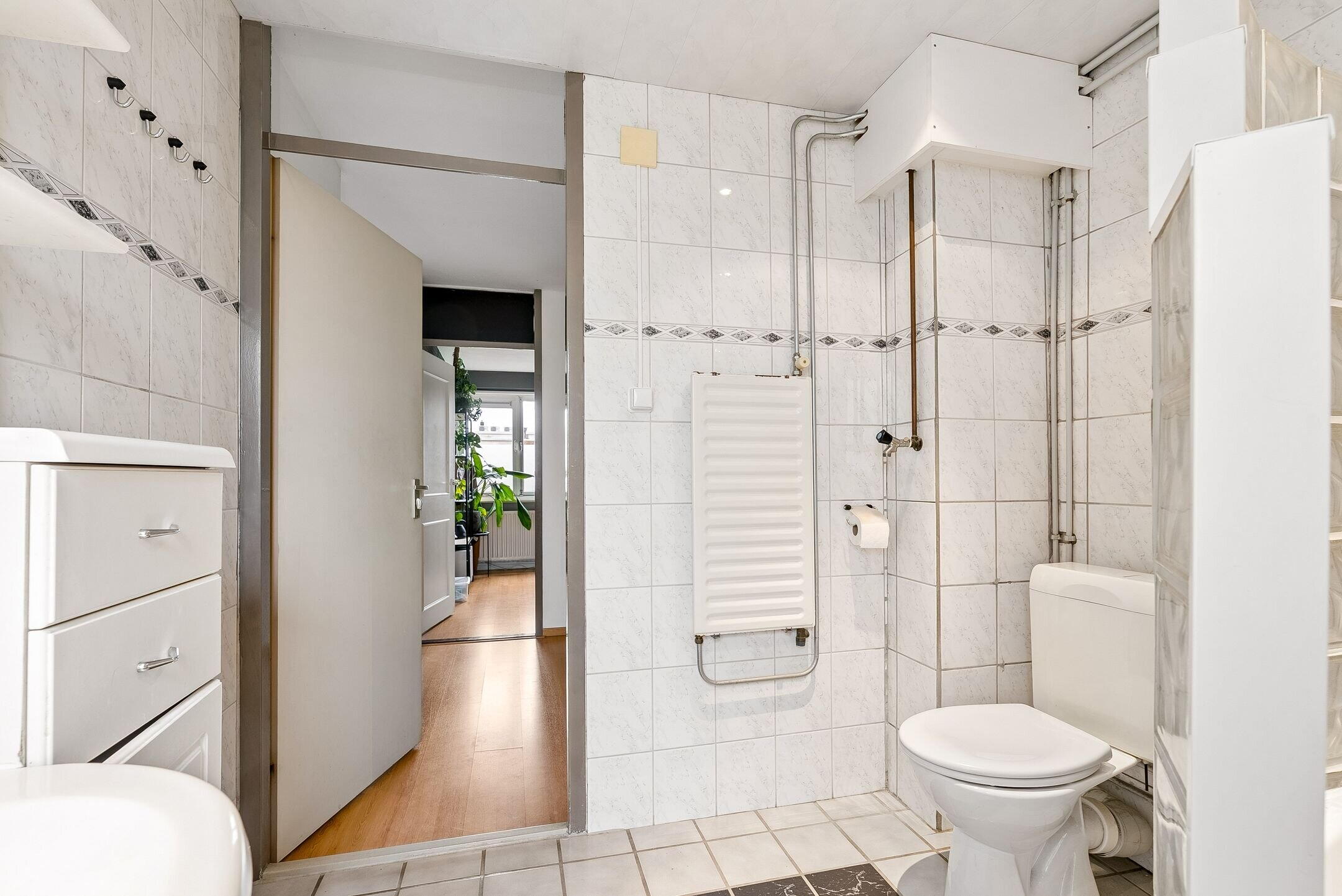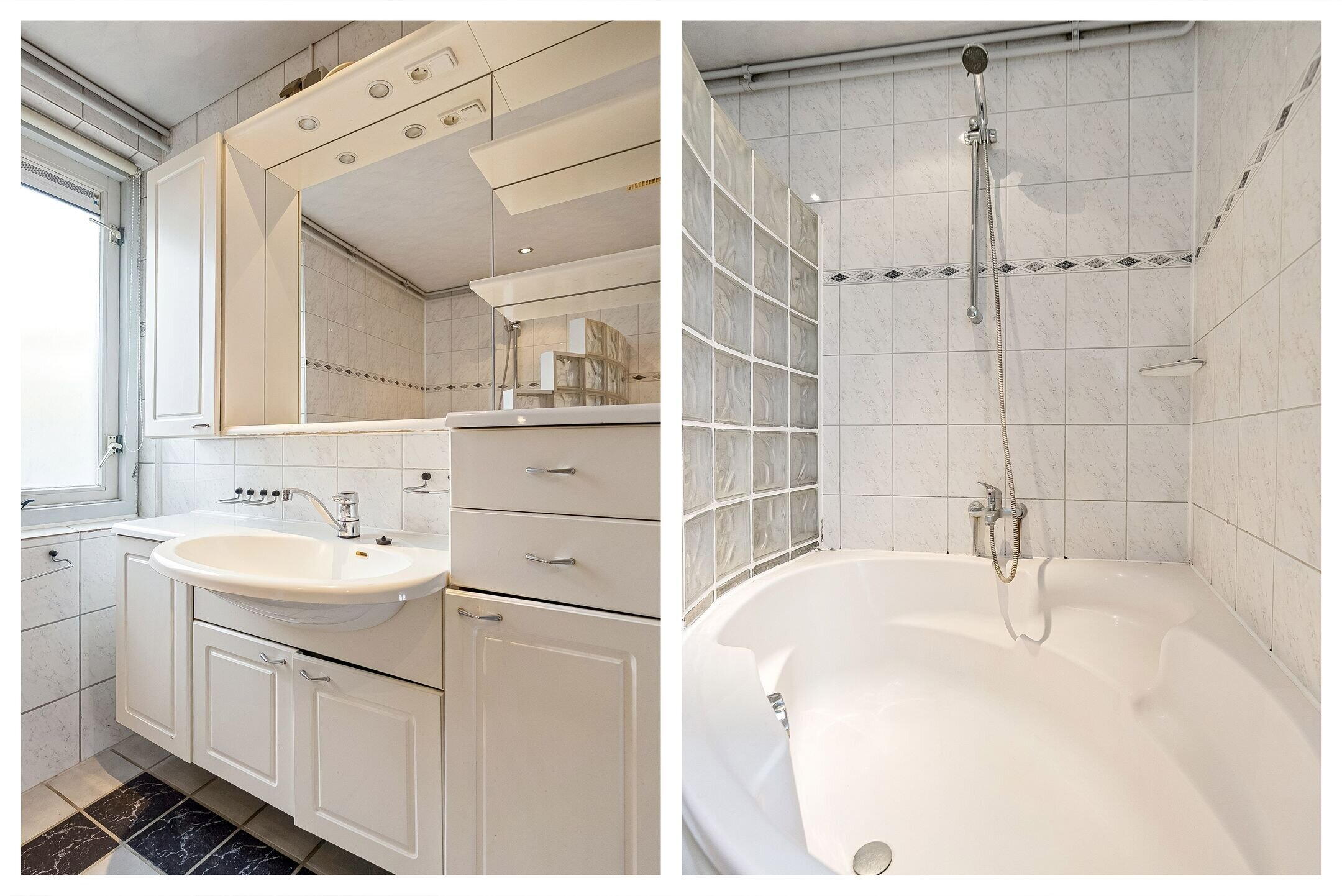 De badkamer is voorzien van een bad-/douchecombinatie, toilet en een wastafel met meubel. Het raam zorgt voor voldoende licht in de badkamer.